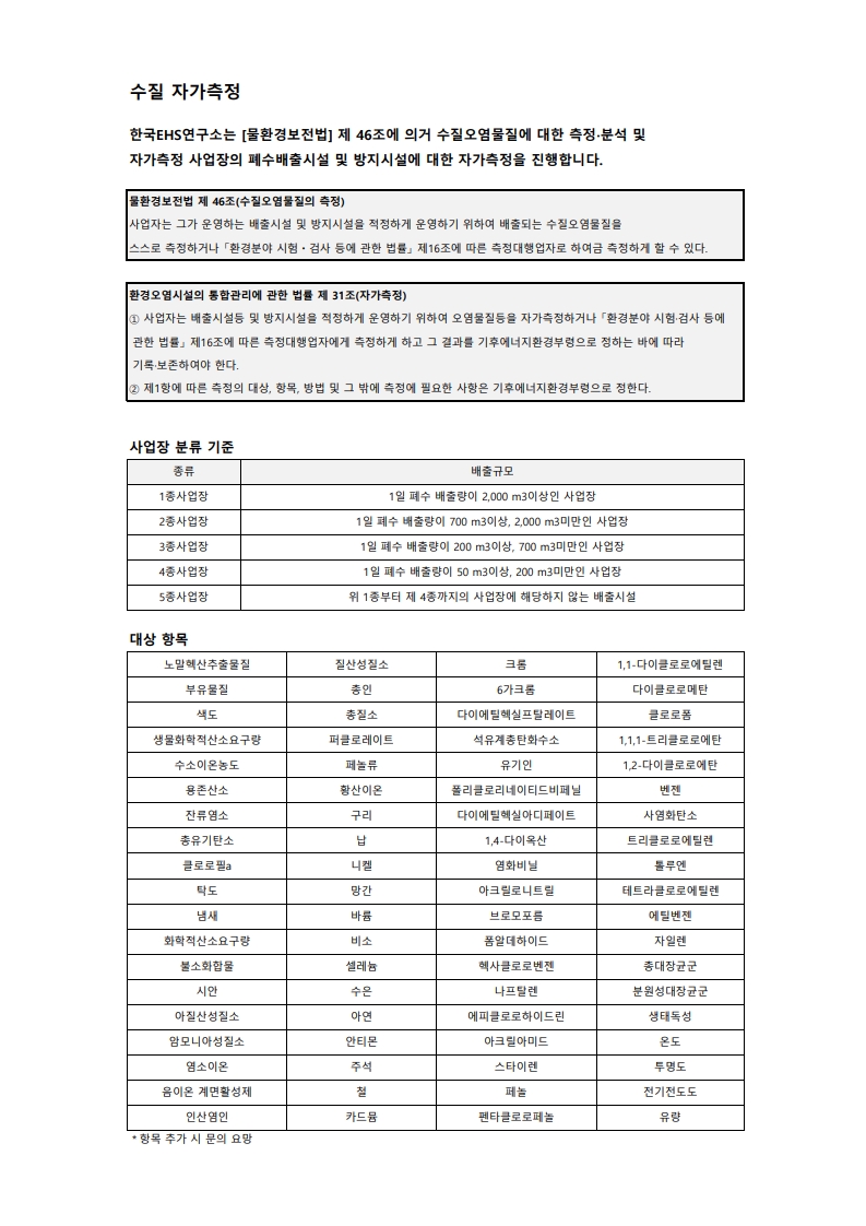 수질자가측정 사업장분류와 현재 본사 측정 진행중인 대상항목 공유드리오니 내용 확인 바랍니다.