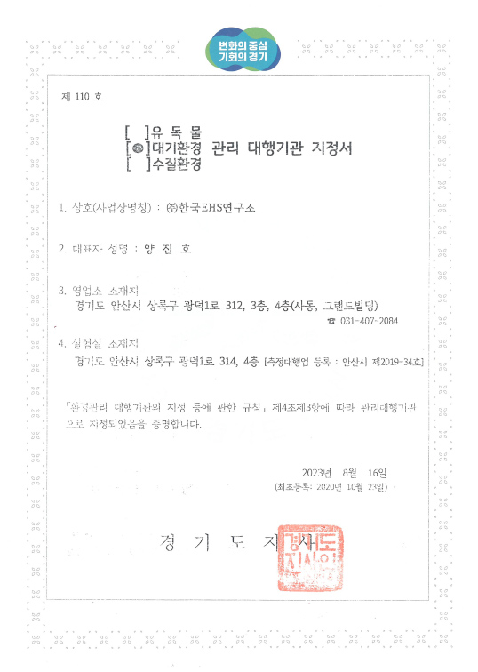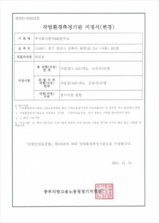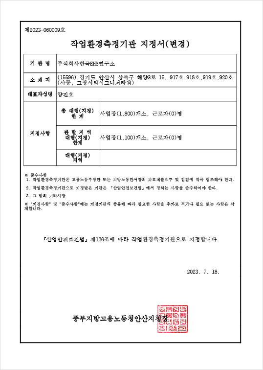 작업환경측정 지정서 - 경기지청