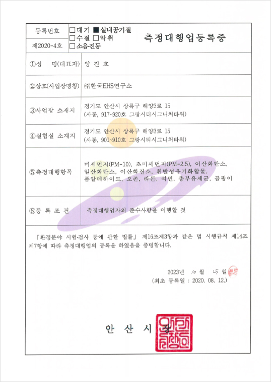 실내공기질 측정대행업 등록증