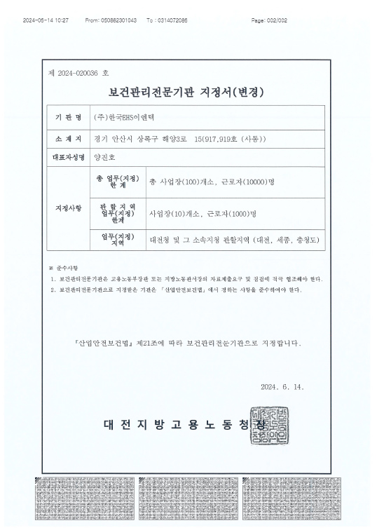 보건관리대행 지정서 - 대전지방고용노동청