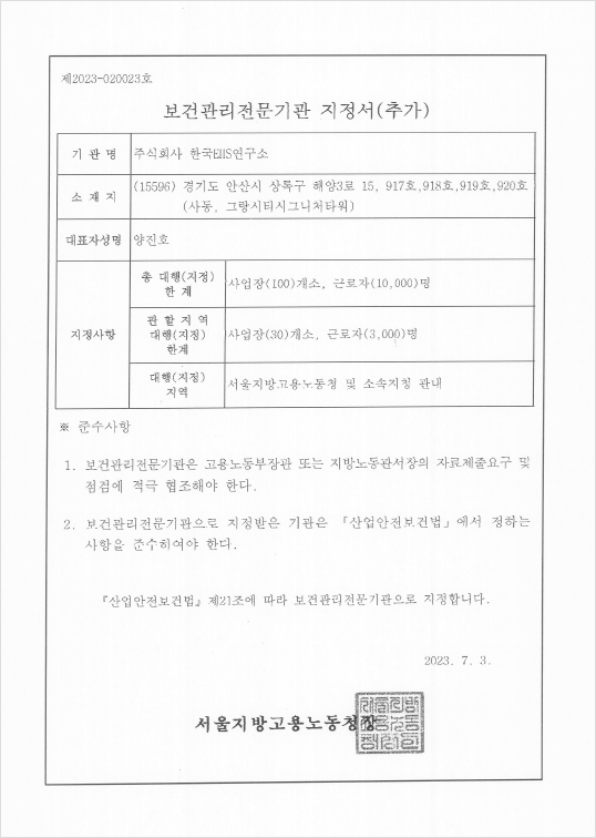 보건관리대행 지정서 - 서울지방고용노동청