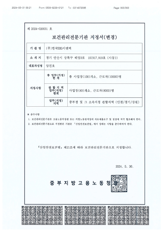 보건관리대행 지정서 - 중부지방고용노동청