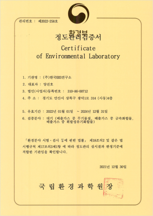 실내공기질 측정정도 관리검증서