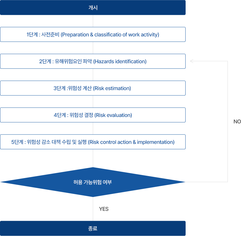 위험성평가는 아래 그림과 같이 사전준비, 유해위험요인 파악, 위험성 계산, 위험성 결정, 위험성 감소대책 수립 및 실행 단계로 추진한다.