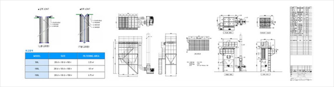 여과재에 포집된 분진은 콤프레샤 AIR에 의해 자동으로 탈진하여 기계적 장치에 의해 HOPPER를 경유하여 외부로 처리하고, 여과된 깨끗한 공기는 배출구(STACK)를 배출한다.