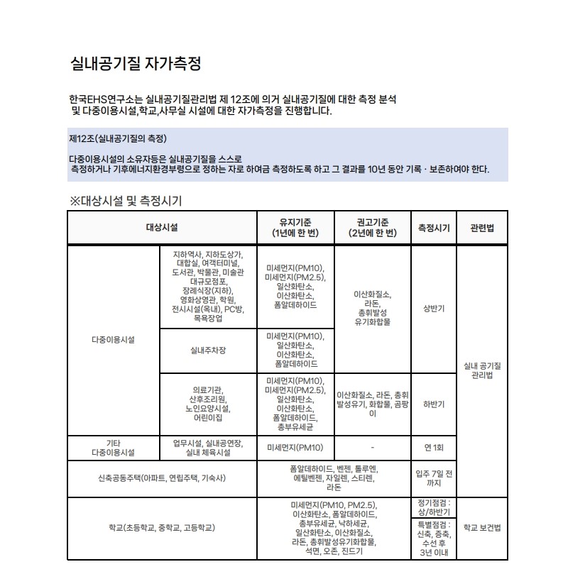 실내공기질 측정 대상 및 항목 등을 공유드리오니 내용 확인 바랍니다.